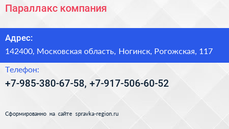 Параллакс, компания по адресу 142400, Московская область, Ногинск, Рогожская, 117 в дальнейшем Организация, размещена в следующих категориях: