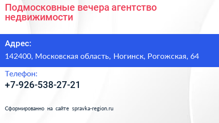 Подмосковные вечера, агентство недвижимости по адресу 142400, Московская область, Ногинск, Рогожская, 64 в дальнейшем Организация, размещена в следующих категориях: