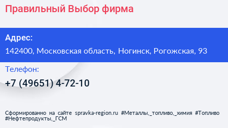 Правильный Выбор, фирма по адресу 142400, Московская область, Ногинск, Рогожская, 93 в дальнейшем Организация, размещена в следующих категориях: