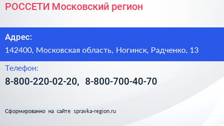 РОССЕТИ Московский регион по адресу 142400, Московская область, Ногинск, Радченко, 13 в дальнейшем Организация, размещена в следующих категориях: