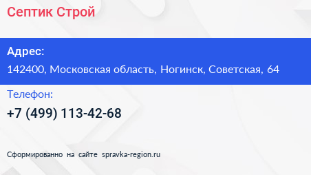 Септик-Строй по адресу 142400, Московская область, Ногинск, Советская, 64 в дальнейшем Организация, размещена в следующих категориях: