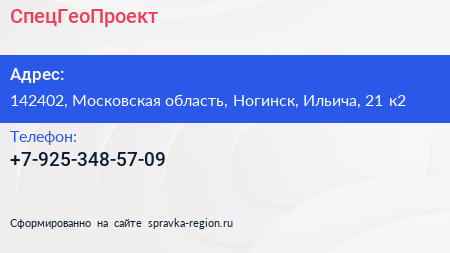 СпецГеоПроект по адресу 142402, Московская область, Ногинск, Ильича, 21 к2 в дальнейшем Организация, размещена в следующих категориях: