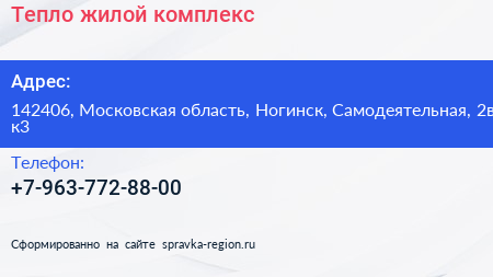 Тепло, жилой комплекс по адресу 142406, Московская область, Ногинск, Самодеятельная, 2в к3 в дальнейшем Организация, размещена в следующих категориях: