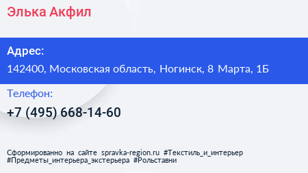 Элька-Акфил по адресу 142400, Московская область, Ногинск, 8 Марта, 1Б в дальнейшем Организация, размещена в следующих категориях:
