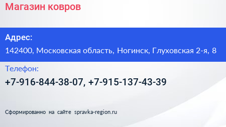 Магазин ковров по адресу 142400, Московская область, Ногинск, Глуховская 2-я, 8 в дальнейшем Организация, размещена в следующих категориях: