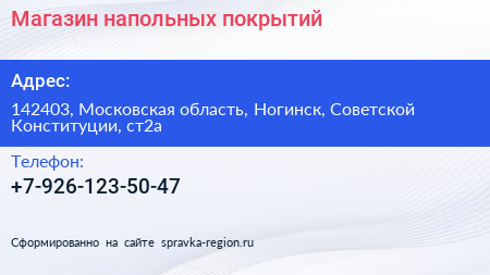 Магазин напольных покрытий по адресу 142403, Московская область, Ногинск, Советской Конституции, ст2а в дальнейшем Организация, размещена в следующих категориях: