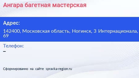 Ангара, багетная мастерская по адресу 142400, Московская область, Ногинск, 3 Интернационала, 69 в дальнейшем Организация, размещена в следующих категориях: