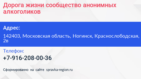 Дорога жизни, сообщество анонимных алкоголиков по адресу 142403, Московская область, Ногинск, Краснослободская, 2в в дальнейшем Организация, размещена в следующих категориях:
