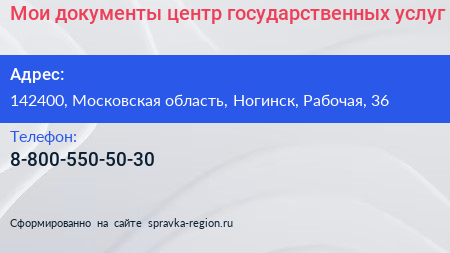 Мои документы, центр государственных услуг по адресу 142400, Московская область, Ногинск, Рабочая, 36 в дальнейшем Организация, размещена в следующих категориях: