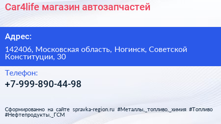 Car4life, магазин автозапчастей по адресу 142406, Московская область, Ногинск, Советской Конституции, 30 в дальнейшем Организация, размещена в следующих категориях: