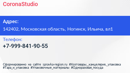 CoronaStudio по адресу 142402, Московская область, Ногинск, Ильича, вл1 в дальнейшем Организация, размещена в следующих категориях: