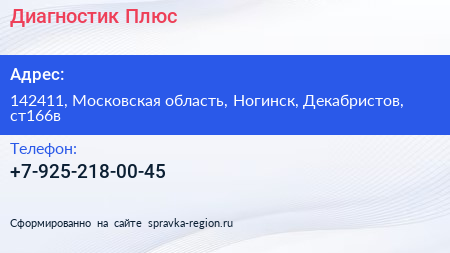 Диагностик Плюс по адресу 142411, Московская область, Ногинск, Декабристов, ст166в в дальнейшем Организация, размещена в следующих категориях:
