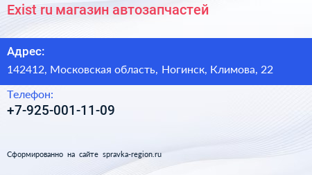 Exist.ru, магазин автозапчастей по адресу 142412, Московская область, Ногинск, Климова, 22 в дальнейшем Организация, размещена в следующих категориях: