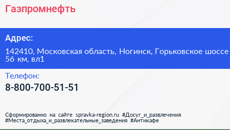 Газпромнефть по адресу 142410, Московская область, Ногинск, Горьковское шоссе 56 км, вл1 в дальнейшем Организация, размещена в следующих категориях: