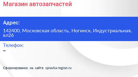 Магазин автозапчастей по адресу 142400, Московская область, Ногинск, Индустриальная, вл26 в дальнейшем Организация, размещена в следующих категориях:
