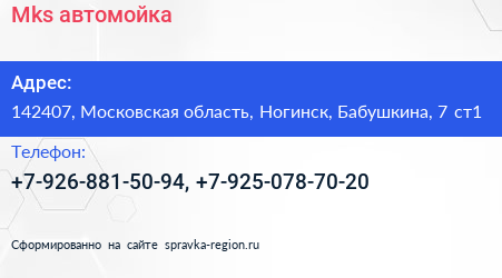 Mks, автомойка по адресу 142407, Московская область, Ногинск, Бабушкина, 7 ст1 в дальнейшем Организация, размещена в следующих категориях: