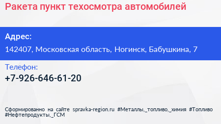 Ракета, пункт техосмотра автомобилей по адресу 142407, Московская область, Ногинск, Бабушкина, 7 в дальнейшем Организация, размещена в следующих категориях: