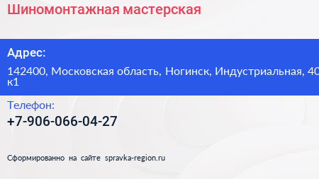 Шиномонтажная мастерская по адресу 142400, Московская область, Ногинск, Индустриальная, 40 к1 в дальнейшем Организация, размещена в следующих категориях: