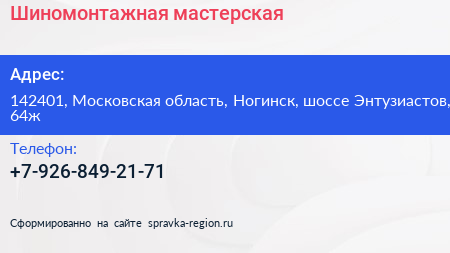 Шиномонтажная мастерская по адресу 142401, Московская область, Ногинск, шоссе Энтузиастов, 64ж в дальнейшем Организация, размещена в следующих категориях: