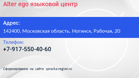 Alter ego, языковой центр по адресу 142400, Московская область, Ногинск, Рабочая, 20 в дальнейшем Организация, размещена в следующих категориях: