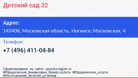 Детский сад №32 по адресу 142408, Московская область, Ногинск, Московская, 4 в дальнейшем Организация, размещена в следующих категориях: