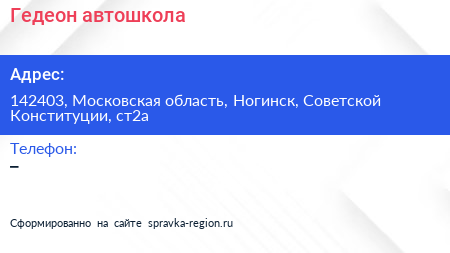 Гедеон, автошкола по адресу 142403, Московская область, Ногинск, Советской Конституции, ст2а в дальнейшем Организация, размещена в следующих категориях: