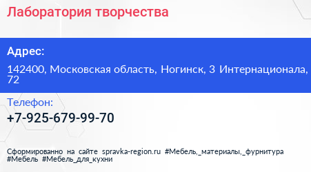 Лаборатория творчества по адресу 142400, Московская область, Ногинск, 3 Интернационала, 72 в дальнейшем Организация, размещена в следующих категориях: