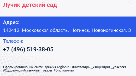 Лучик, детский сад по адресу 142412, Московская область, Ногинск, Новоногинская, 3 в дальнейшем Организация, размещена в следующих категориях: