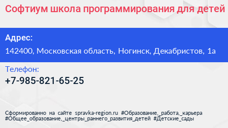 Софтиум, школа программирования для детей по адресу 142400, Московская область, Ногинск, Декабристов, 1а в дальнейшем Организация, размещена в следующих категориях: