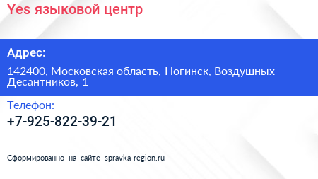 Yes, языковой центр по адресу 142400, Московская область, Ногинск, Воздушных Десантников, 1 в дальнейшем Организация, размещена в следующих категориях:
