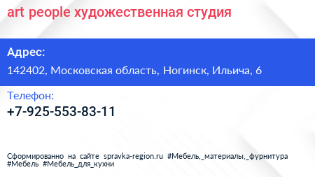 art people, художественная студия по адресу 142402, Московская область, Ногинск, Ильича, 6 в дальнейшем Организация, размещена в следующих категориях: