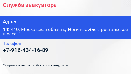 Служба эвакуатора по адресу 142410, Московская область, Ногинск, Электростальское шоссе, 1 в дальнейшем Организация, размещена в следующих категориях: