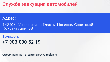 Служба эвакуации автомобилей по адресу 142406, Московская область, Ногинск, Советской Конституции, 88 в дальнейшем Организация, размещена в следующих категориях: