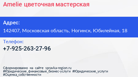 Amelie, цветочная мастерская по адресу 142407, Московская область, Ногинск, Юбилейная, 18 в дальнейшем Организация, размещена в следующих категориях: