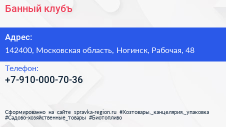 Банный клубъ по адресу 142400, Московская область, Ногинск, Рабочая, 48 в дальнейшем Организация, размещена в следующих категориях:
