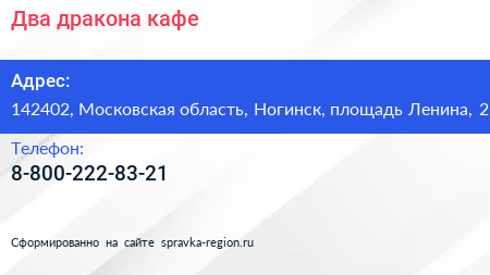 Два дракона, кафе по адресу 142402, Московская область, Ногинск, площадь Ленина, 2 в дальнейшем Организация, размещена в следующих категориях:
