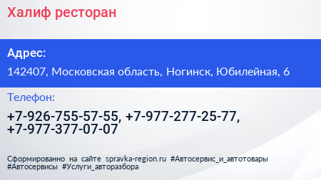 Халиф, ресторан по адресу 142407, Московская область, Ногинск, Юбилейная, 6 в дальнейшем Организация, размещена в следующих категориях: