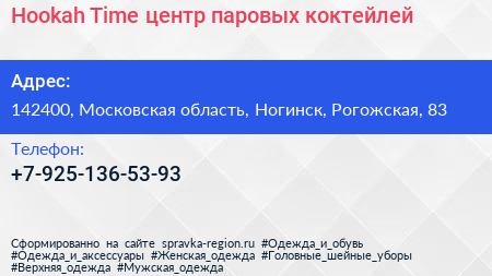 Hookah Time, центр паровых коктейлей по адресу 142400, Московская область, Ногинск, Рогожская, 83 в дальнейшем Организация, размещена в следующих категориях: