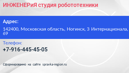ИНЖЕНЕРиЯ, студия робототехники по адресу 142400, Московская область, Ногинск, 3 Интернационала, 69 в дальнейшем Организация, размещена в следующих категориях: