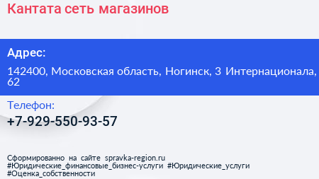 Кантата, сеть магазинов по адресу 142400, Московская область, Ногинск, 3 Интернационала, 62 в дальнейшем Организация, размещена в следующих категориях: