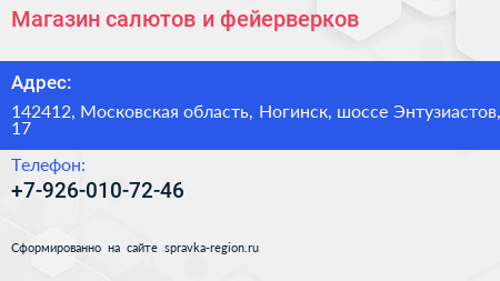 Магазин салютов и фейерверков по адресу 142412, Московская область, Ногинск, шоссе Энтузиастов, 17 в дальнейшем Организация, размещена в следующих категориях:
