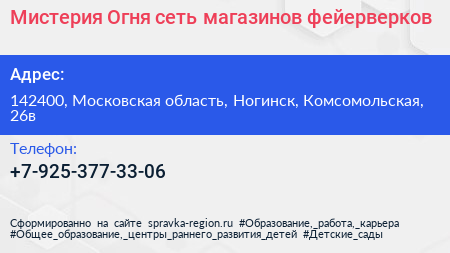 Мистерия Огня, сеть магазинов фейерверков по адресу 142400, Московская область, Ногинск, Комсомольская, 26в в дальнейшем Организация, размещена в следующих категориях: