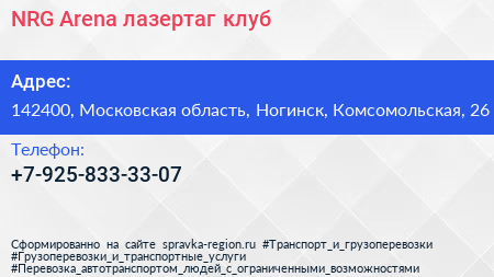 NRG Arena, лазертаг-клуб по адресу 142400, Московская область, Ногинск, Комсомольская, 26 в дальнейшем Организация, размещена в следующих категориях: