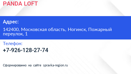 PANDA LOFT по адресу 142400, Московская область, Ногинск, Пожарный переулок, 1 в дальнейшем Организация, размещена в следующих категориях: