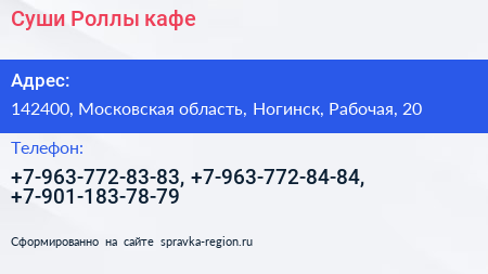 Суши & Роллы, кафе по адресу 142400, Московская область, Ногинск, Рабочая, 20 в дальнейшем Организация, размещена в следующих категориях: