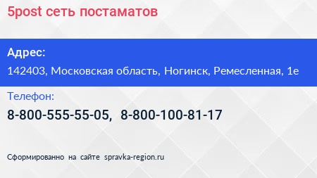 5post, сеть постаматов по адресу 142403, Московская область, Ногинск, Ремесленная, 1е в дальнейшем Организация, размещена в следующих категориях: