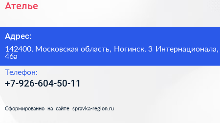 Ателье по адресу 142400, Московская область, Ногинск, 3 Интернационала, 46а в дальнейшем Организация, размещена в следующих категориях: