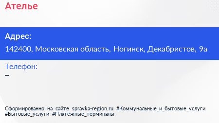 Ателье по адресу 142400, Московская область, Ногинск, Декабристов, 9а в дальнейшем Организация, размещена в следующих категориях: