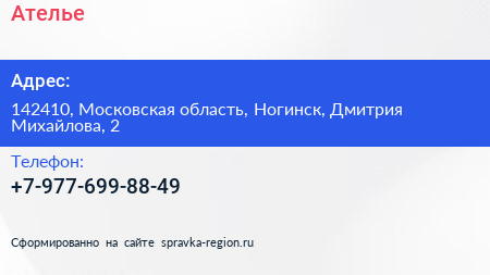 Ателье по адресу 142410, Московская область, Ногинск, Дмитрия Михайлова, 2 в дальнейшем Организация, размещена в следующих категориях: