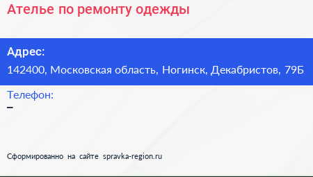 Ателье по ремонту одежды по адресу 142400, Московская область, Ногинск, Декабристов, 79Б в дальнейшем Организация, размещена в следующих категориях: